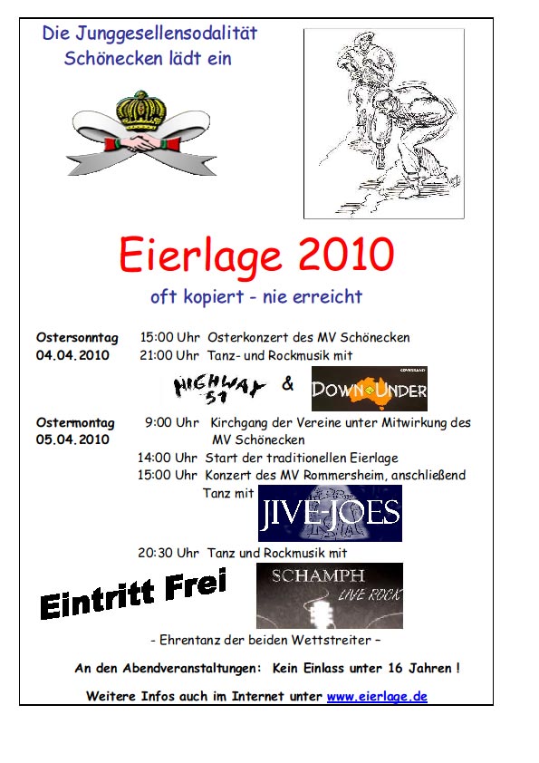 Raffer und Läufer der diesjährigen Eierlage sind Dirk Schifferings und Michael Roderich. Wobei der 29 jährige Informatiker Dirk Schifferings raffen wird und der 29 jährige Vermessungstechniker Michael Roderich den Weg nach Seiwerath antritt.  |